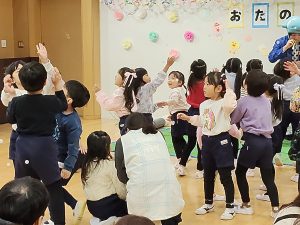 まずは、TOMOさんがシャボン玉と一緒に登場し、様々な大きさのシャボン玉を作って、観客の頭上にたくさん飛ばしてくれました。園のおともだちはみんな大喜び!続けていろいろなものを使ってシャボン玉を作ってみたり、中に「香り」のする煙をいれたシャボン玉を作って、何の果物かを当てるクイズをしたり、時折マジックを交えたりもして、とっても楽しいシャボン玉ショーでした。園児ばかりでなく、観に来てくれた保護者の皆さまや小さな兄弟、姉妹も一緒に楽しめたショーでした。最後は、全員が一人ずつ大きなシャボンの中に入って記念撮影をしたりもしました。TOTMOさん、ありがとうございました!
