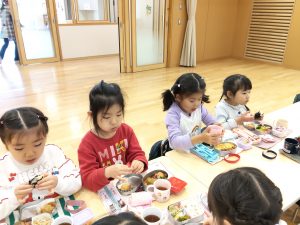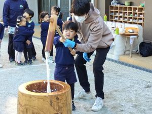 幼稚園のみんなも一人ずつ全員がお餅をつき、来てくれたお父さん、お母さん、先生もおもちをついて今年一年の締めくくりをしました。