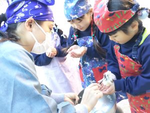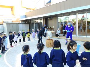 朝から少し風があり、寒い日となりましたが、暖かいお餅をお父さんたちが園児みんなのために一生懸命ついてくれました。