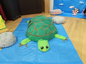 2/14(土) 作品展を実施しました。園児たちは前日からの準備で大きなカメとサメの人形をみんなで協力してホールまで運びました。