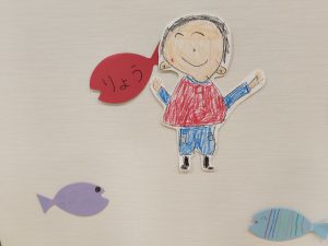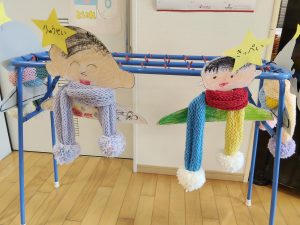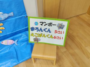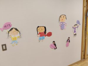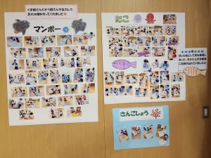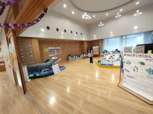 2/14(土) 作品展を実施しました。園児たちは前日からの準備で大きなカメとサメの人形をみんなで協力してホールまで運びました。