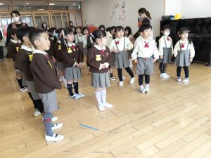 全員出席で、くま組は進級の証の名札を一人ずつ、園長先生から手渡されましたが、自分の名前が呼ばれるまでドキドキでした。最後には、くま組全員の進級とぞう組全員の卒園が決定し、無事、修了式を終えることができました。
