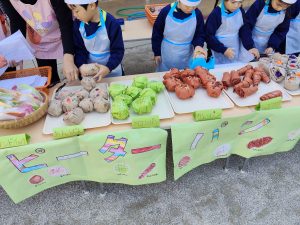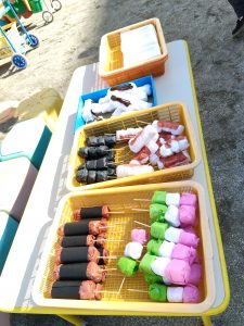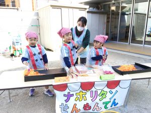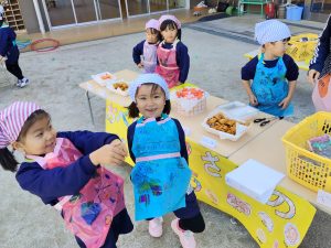 「お弁当屋さん」「パン屋さん」「お寿司屋さん」「スパゲッティー屋さん」とそれぞれが工夫を凝らしたおいしそうな食べ物が店先に並び、お客はお父さんやお母さんで、何度も並んで各店舗が売り切れになるまでお買い上げいただきました。