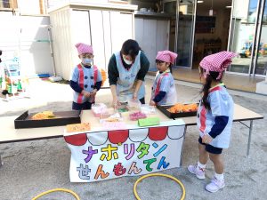 参観日なので、お父さん、お母さんたちが大勢見守る中、開店を告げるあいさつの後、「いらっしゃいませ!」の威勢の良い声が園庭に響き、とっても楽しい「お店屋さん」たくさん開店しました。