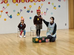 11月は2名のおともだちのお誕生日会でした。いつものように楽しくそれぞれにインタビューをして、好きな食べ物やお誕生日のプレゼントで欲しいものや将来の夢などについて発表してもらいました。